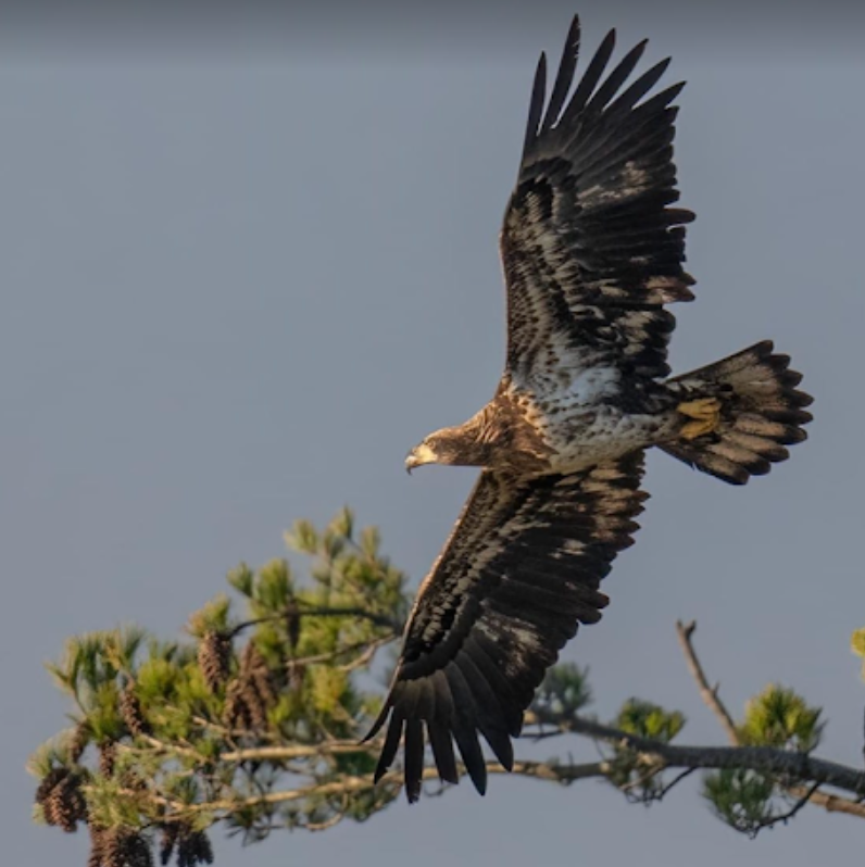 Third Year Bald Eagles (immature/sub adult) transition back to dark brown feathers throughout its body, with a whiter tail, yellower beak, lighter eyes, and a more defined Osprey-like "eye stripe." Third year birds typically have white speckled bellies. The primaries will have less of a messy look on the trailing edge of the wings and will likely have one or two residual juvenile primaries (the longer, pointier ones). White on the back is less prominent than on 2nd-years, but the white on the head is more prominent. 3rd-year birds have adult-shaped wings. From afar, a third year eagle (hatched 2023) will look more adult-like than a second year eagle with a darker belly and back, less white under the wings, a whiter head and a more yellow bill.