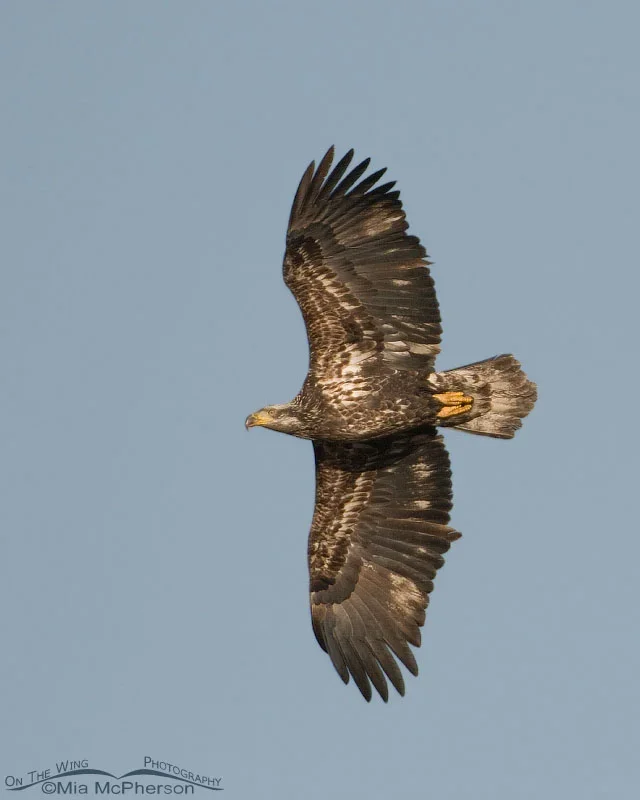NOTE: Each individual eagle is highly variable in plumage and the best way to age a sub-adult is by carefully observing the primaries during flight. Second year eagles have the most irregular primary feathers as they shed the longer, pointier juvenile flight feathers. Third year eagles will display a couple of juvenile flight feathers that noticeably stick out past the trailing edge of the wing.
