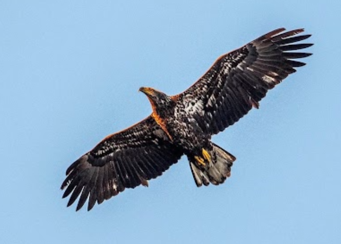 Juveniles / First Year Bald Eagles will appear mostly dark with white wing pits (armpits).