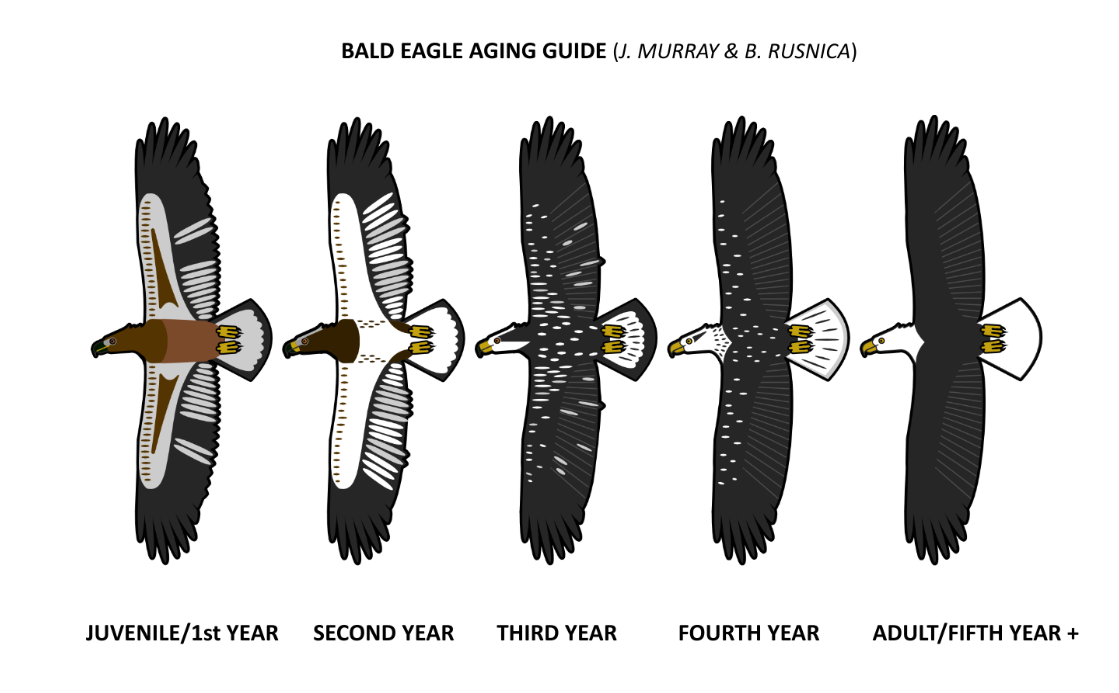 To summarize the appearance of the different ages of Bald Eagles from afar: