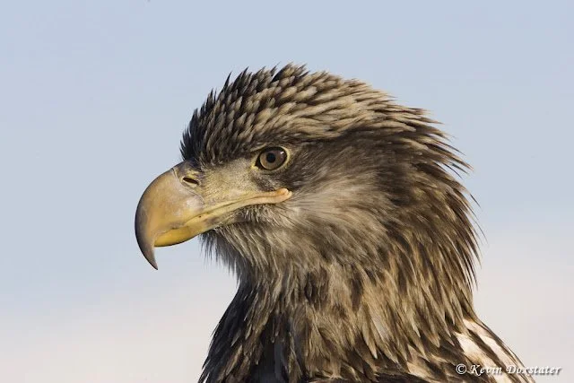 Second Year Bald Eagles (immature/subadult) display the whitest plumage with messy-looking flight feathers (primary and secondary flight feathers molting from juvenile to adult stage). 2nd-year Birds typically have a white belly and upper back, and a dusky bill with hints of yellow at the base. The eyes are still mostly dark. From afar, a second year eagle (hatched 2024) will appear mostly white on the belly, back, and wings and its molting primaries will give the trailing edge of wings a ragged look. Generally, this plumage will be the whitest and messiest looking.